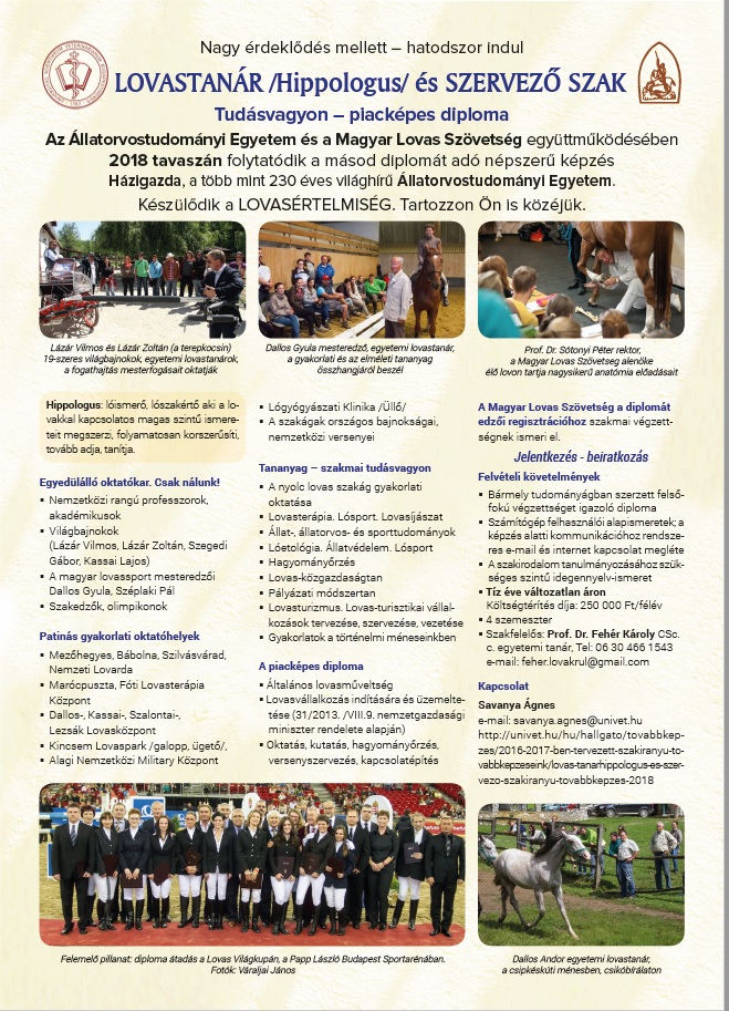 Terveink szerint 2019. február havában, az Állatorvostudományi Egyetemen, hatodik alkalommal indítjuk a LOVASTANÁR-HIPPOLÓGUS SZAKUNKAT.