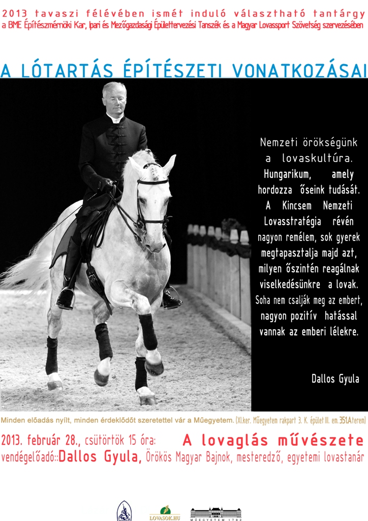 2013. tavasz félévében újra elindul a Magyar Lovassport Szövetség szervezésében, a „Lótartás Építészeti Vonatkozásai” című választható tárgy, a BME Építészmérnöki Karának Ipari és Mezőgazdasági Épülettervezési Tanszékén. A 12 alkalomból álló sorozat, csak minden 2. évben érhető el a hallgatók számára. A tantárgy előadásait, melynek tárgyfelelőse Lázár Antal, DLA, Ybl- és Kossuth-díjas, Pro Architektúra-díjas professzor, a Műegyetem tanárai mellett neves vendégelőadók tartják. Legközelebb, Dallos Gyula, mesteredző előadásának témája a lovaglás művészete, ezen belül: - A ló szerepe, hatása az emberiségre, a művészetre, a világ és a magyar történelemre, az egyetemes sportra. - A ló és ember kapcsolatának kezdete, és a végkifejlet, mégpedig a magasiskola fokán, az olimpia szintjén. - A magyar ember, és a ló